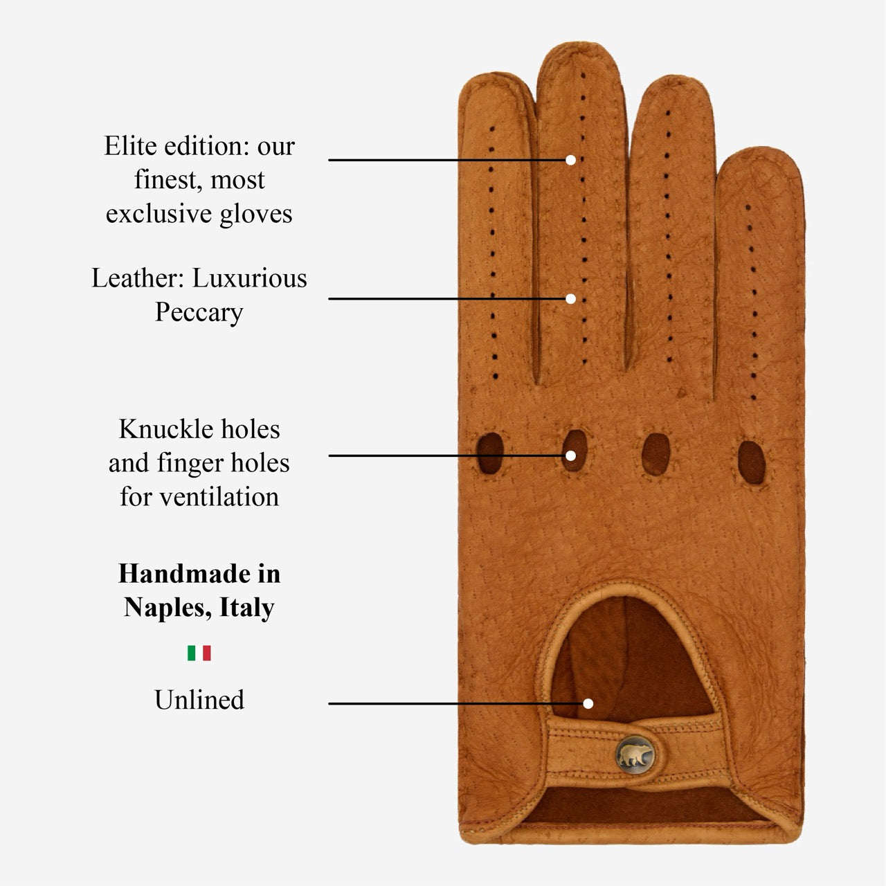 Peccary Leather: Known for its luxurious softness, peccary leather molds effortlessly to your hands, providing unparalleled comfort. The Rafaella gloves also feature discreet ventilation holes to keep your hands cool and prevent sweating during long drives. With their unlined design, these gloves give you maximum dexterity and control, making them the perfect driving companion.