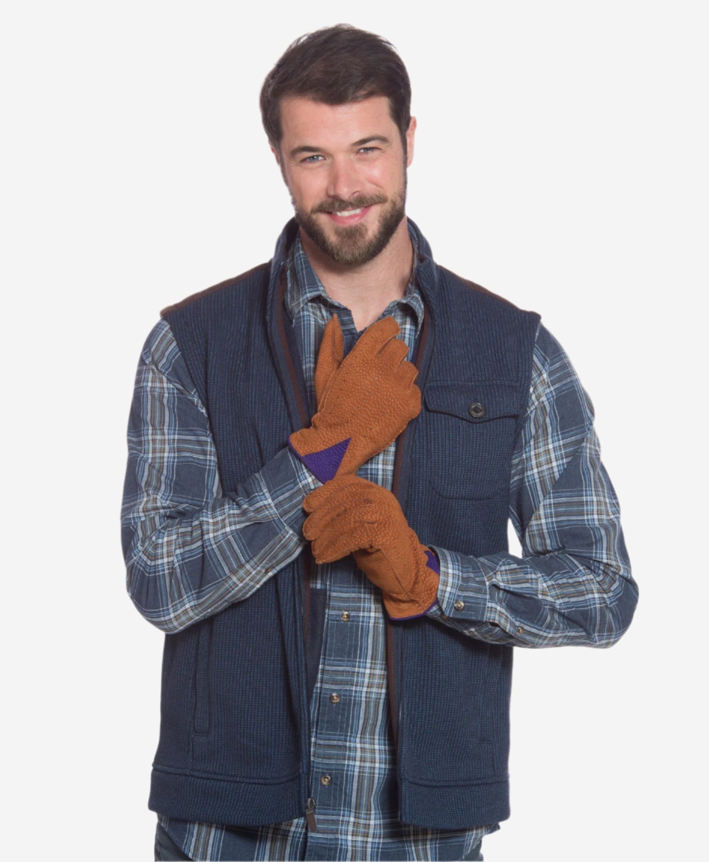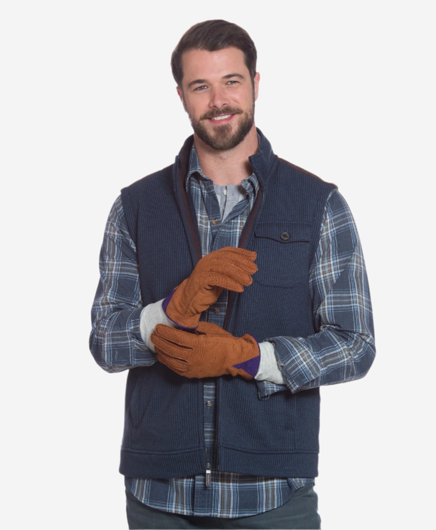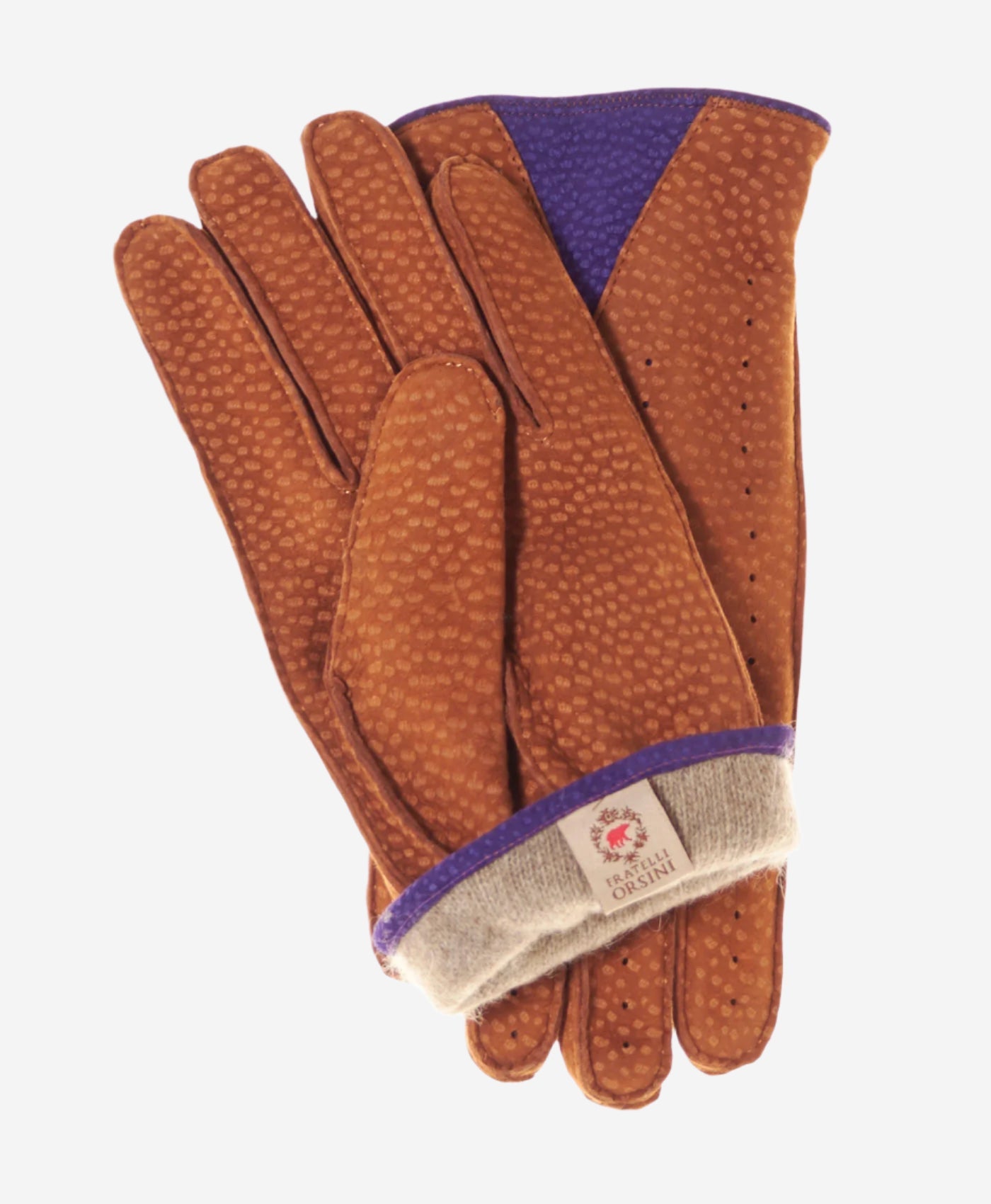 These cashmere lined dress gloves made from the exotic carpincho leather. Carpincho leather, comes from the South American capybara and has a truly unique appearance and feel. These gloves are offered in the cork color with a purple triangular insert that highlights the natural carpincho grain. Lined in 100% Italian cashmere, these are one of the more luxurious pairs of dress gloves available from the artisans at Fratelli Orsini!