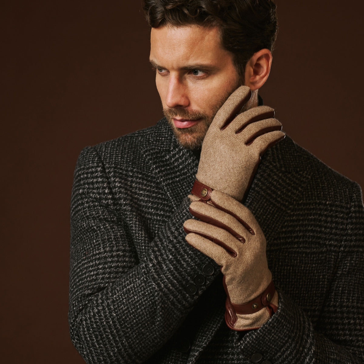Fabrizio (brown) - Tweed men's gloves with touchscreen capability and adjustable snap button