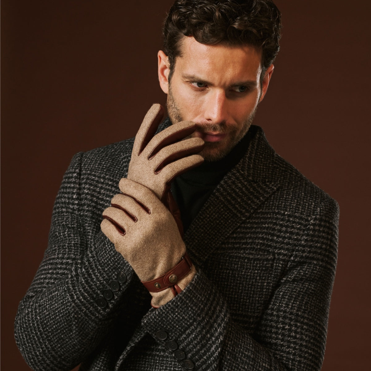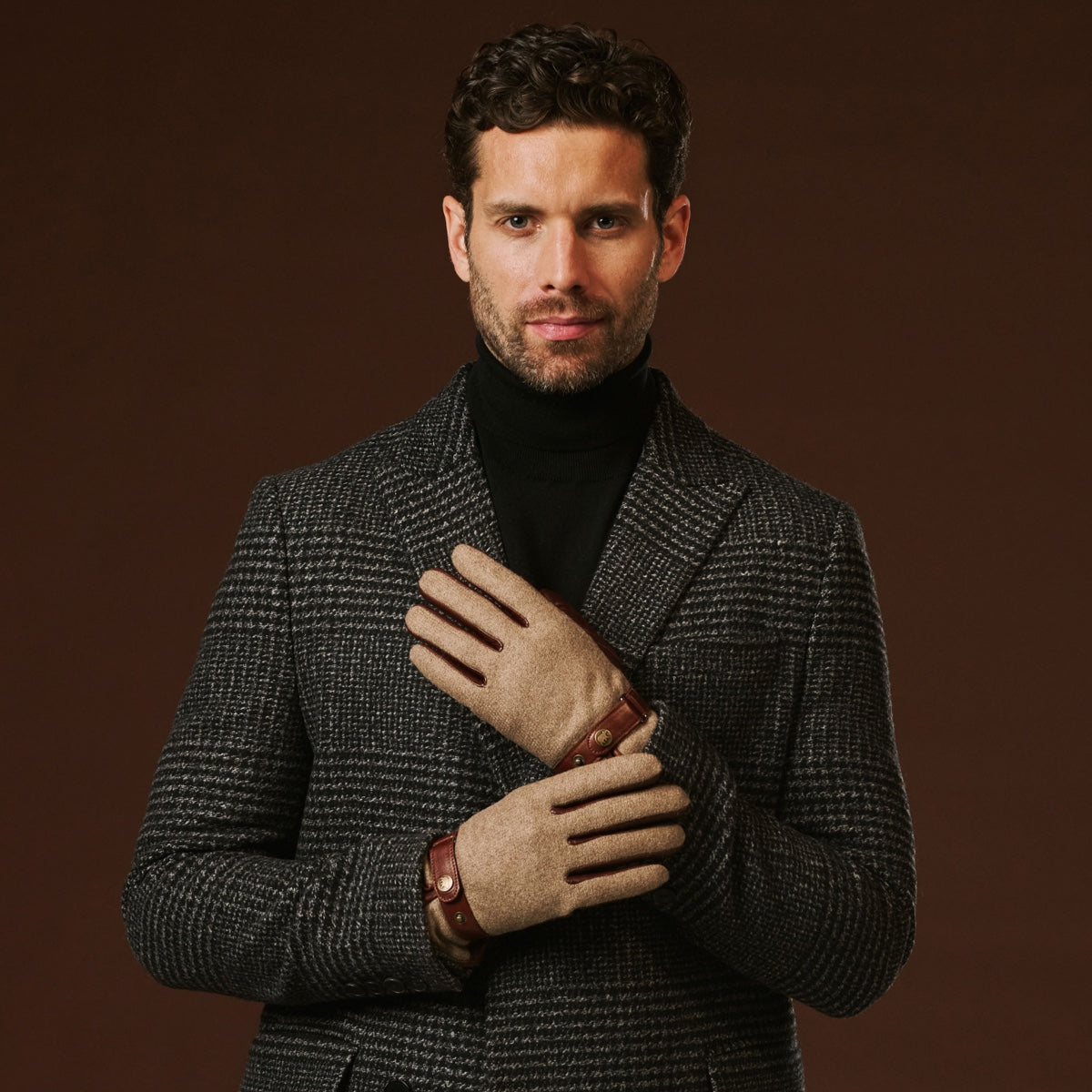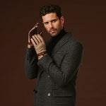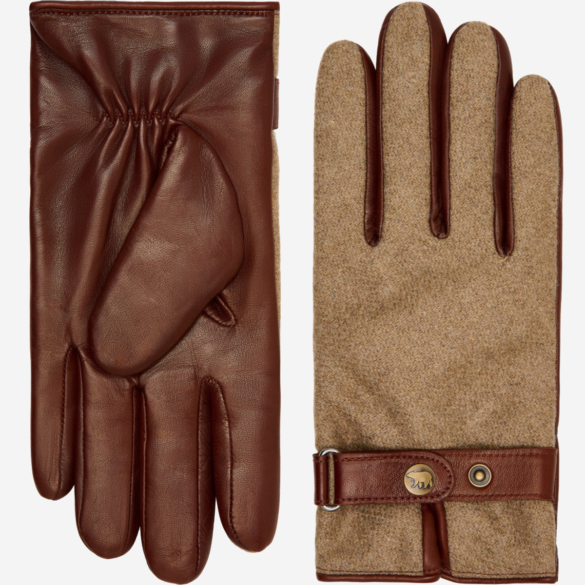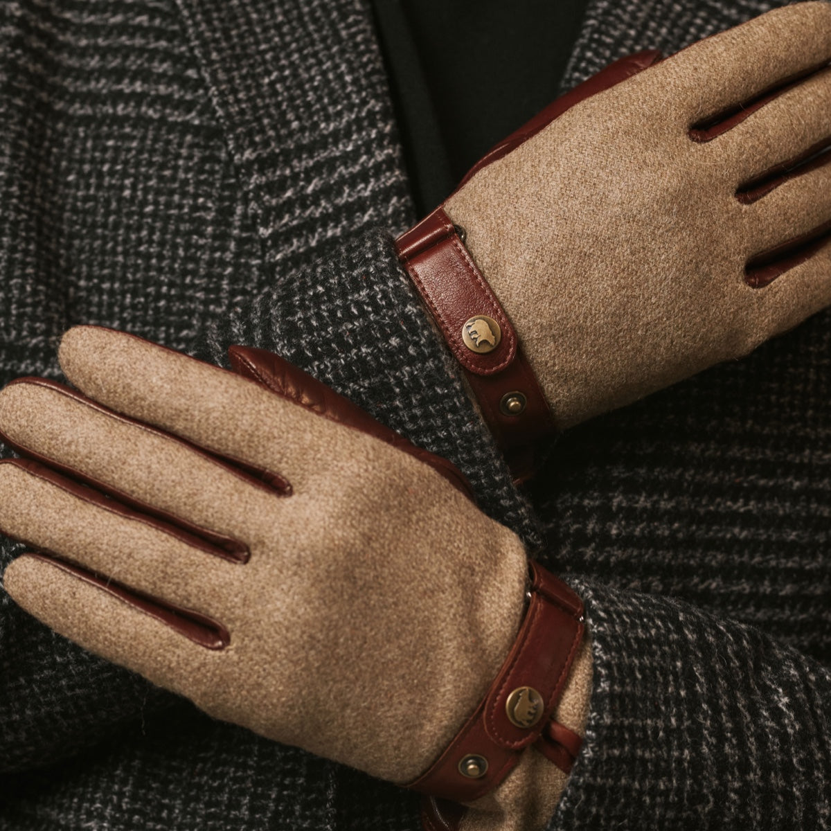 Premium materials: Smooth Italian lambskin leather on the palm ensures durability, comfort, and a secure grip, while the back is finished in soft, textured wool tweed. A leather strap with snap button adds a refined, tailored touch.