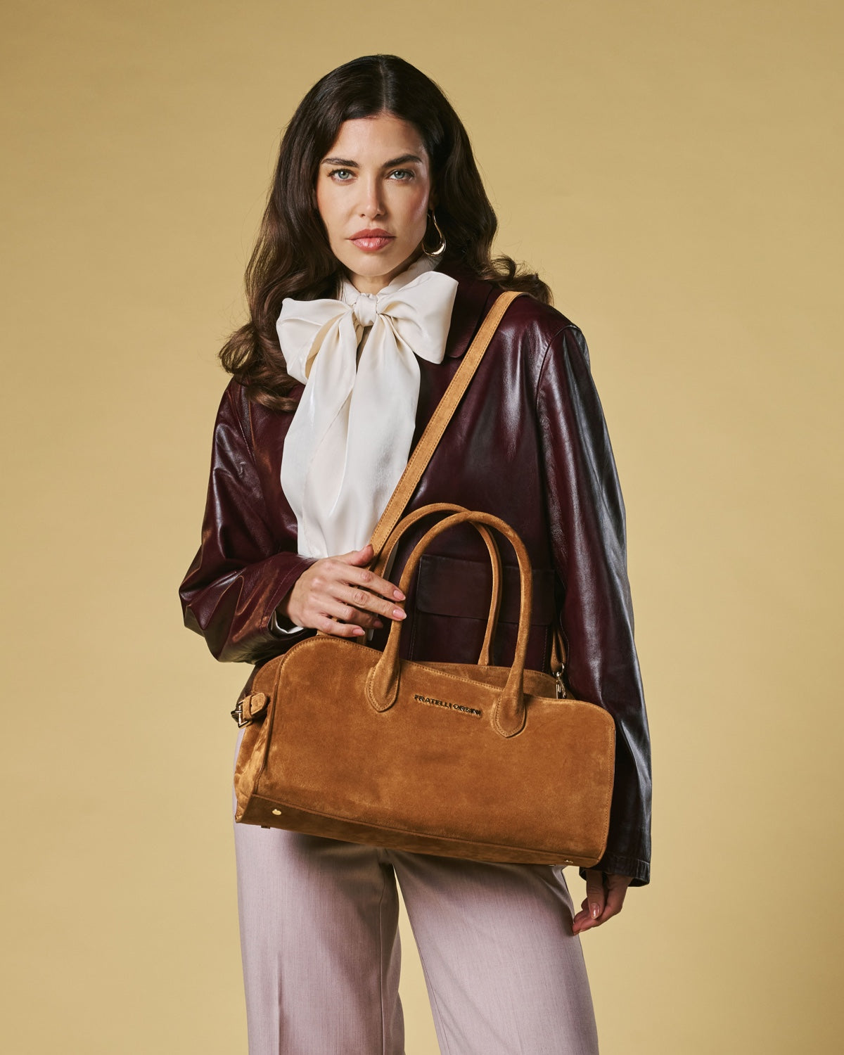Designed with a focus on comfortable daily use, the Chiara Cognac maintains a balanced profile while providing ample room for personal items. It measures 37.5 cm in width, 21 cm in height and 17.5 cm in depth, with a total capacity of 13.8 liters. The suede surface will gain character over time, developing a subtle patina that reflects the Italian craftsmanship of Fratelli Orsini.