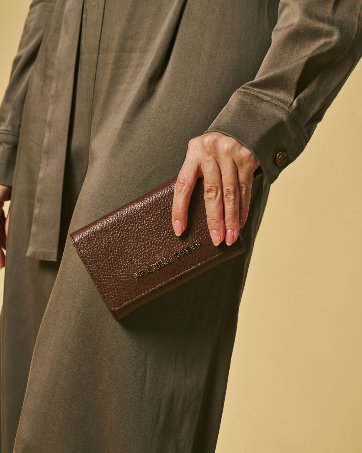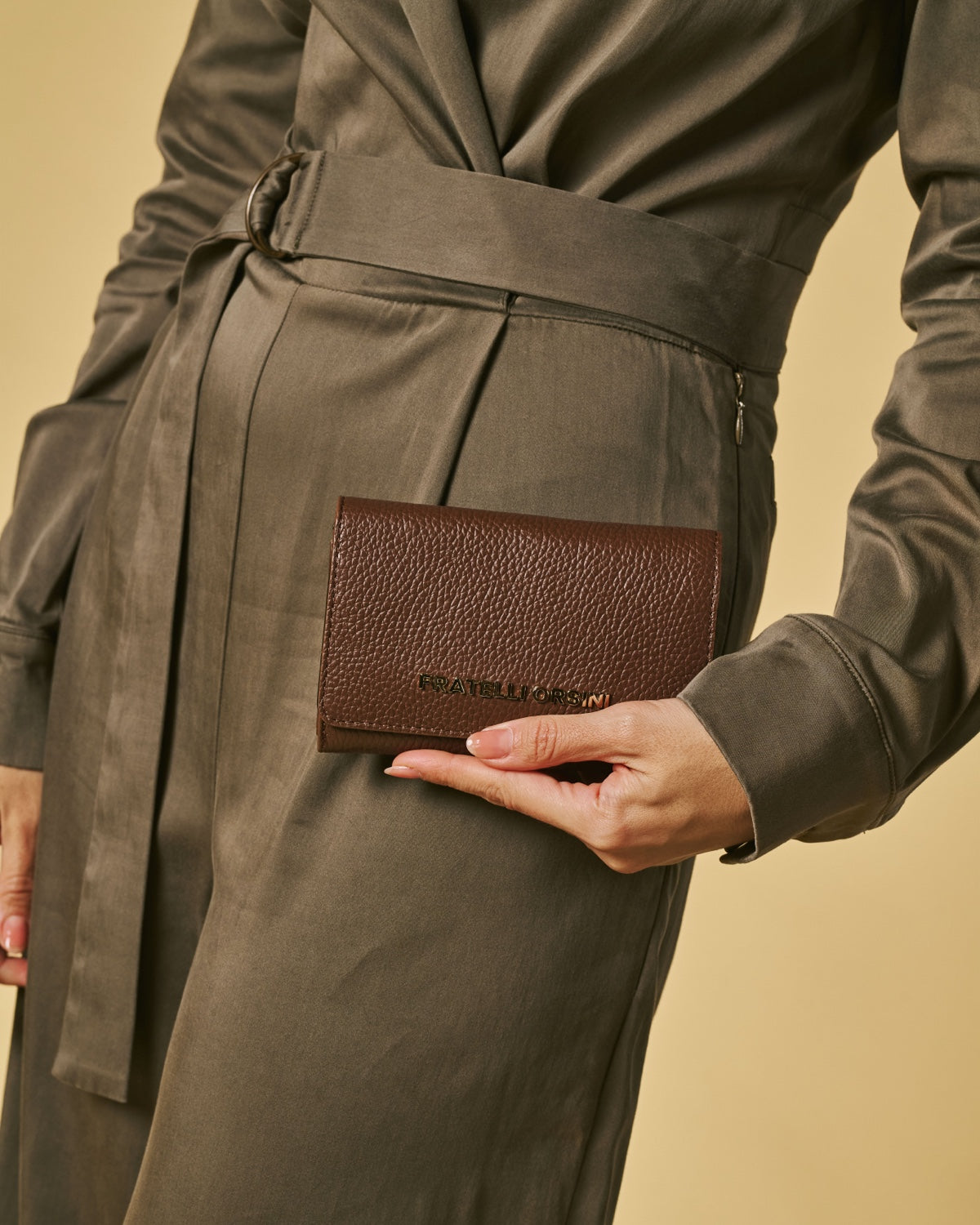 Measuring 15 cm in width, 10 cm in height and 2.5 cm in depth, the Costanza offers practical space for cards, bills and coins, secured with a neat snap closure. Its understated styling reflects the quiet elegance that defines Fratelli Orsini leather goods.