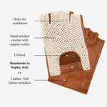 Daniella (cognac) - Hand-sewn Italian crochet driving gloves from lambskin leather