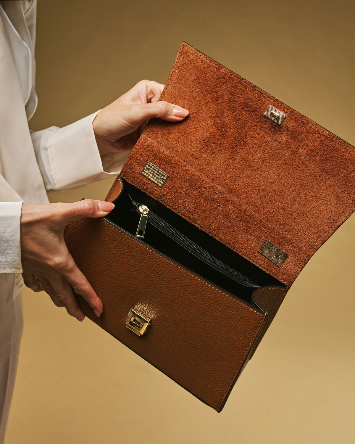 Designed for light daily essentials, the Federica Cognac remains sleek and well-balanced, measuring 27 cm in width, 16 cm in height and 9.5 cm in depth, with a capacity of 4.1 liters. The detachable shoulder strap allows for both crossbody and handheld styling, making it a versatile companion that carries the quiet elegance of Italian craftsmanship from Fratelli Orsini.