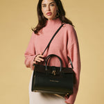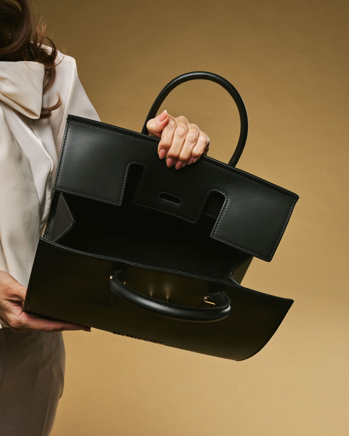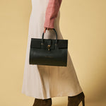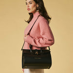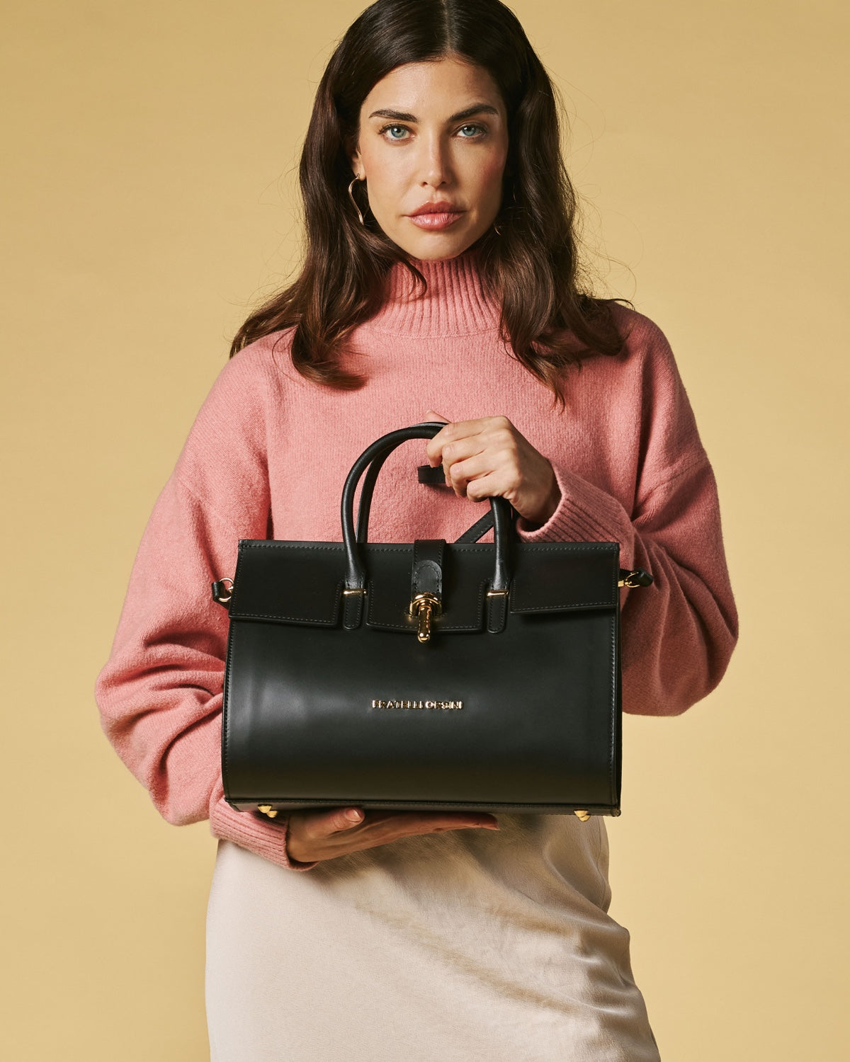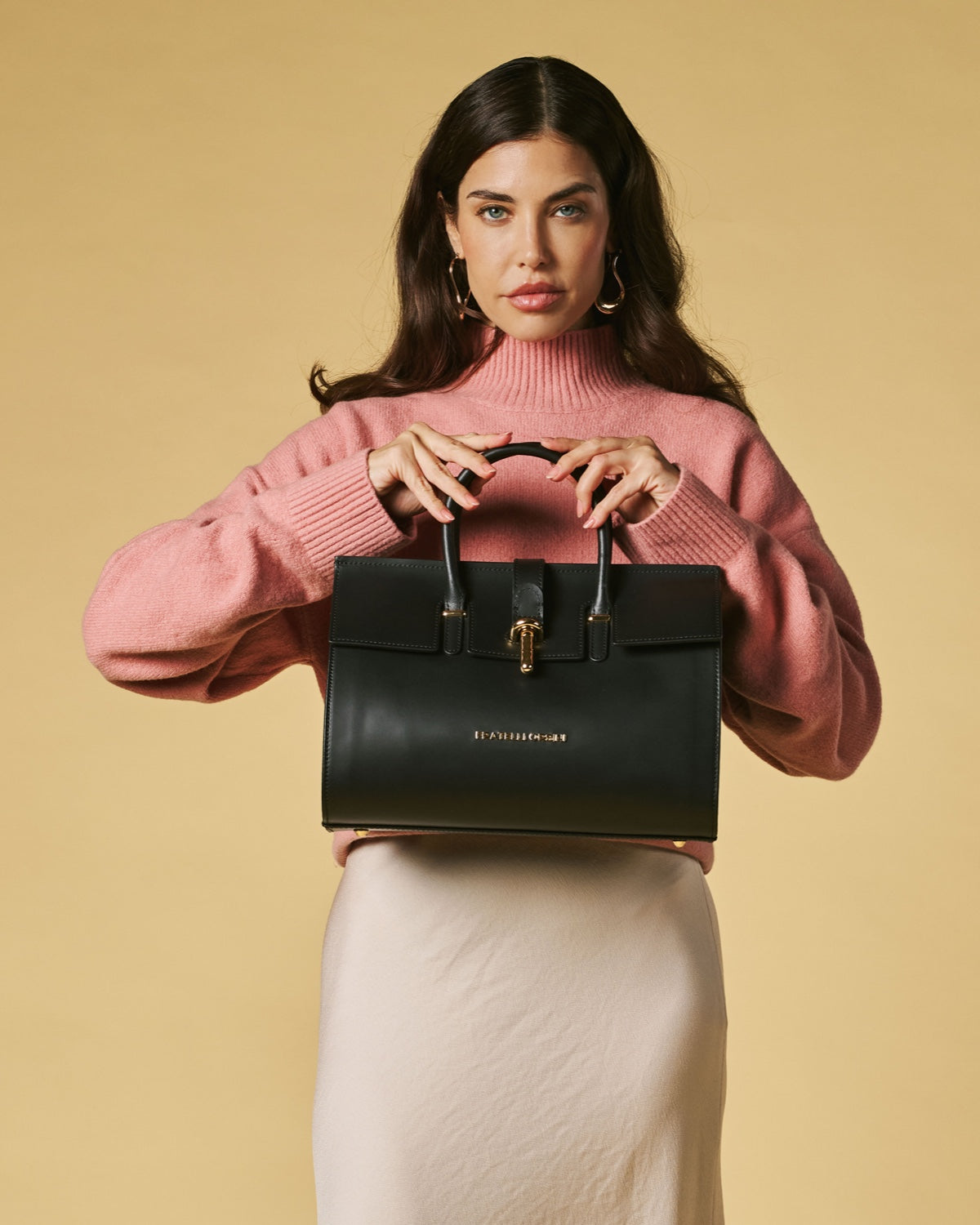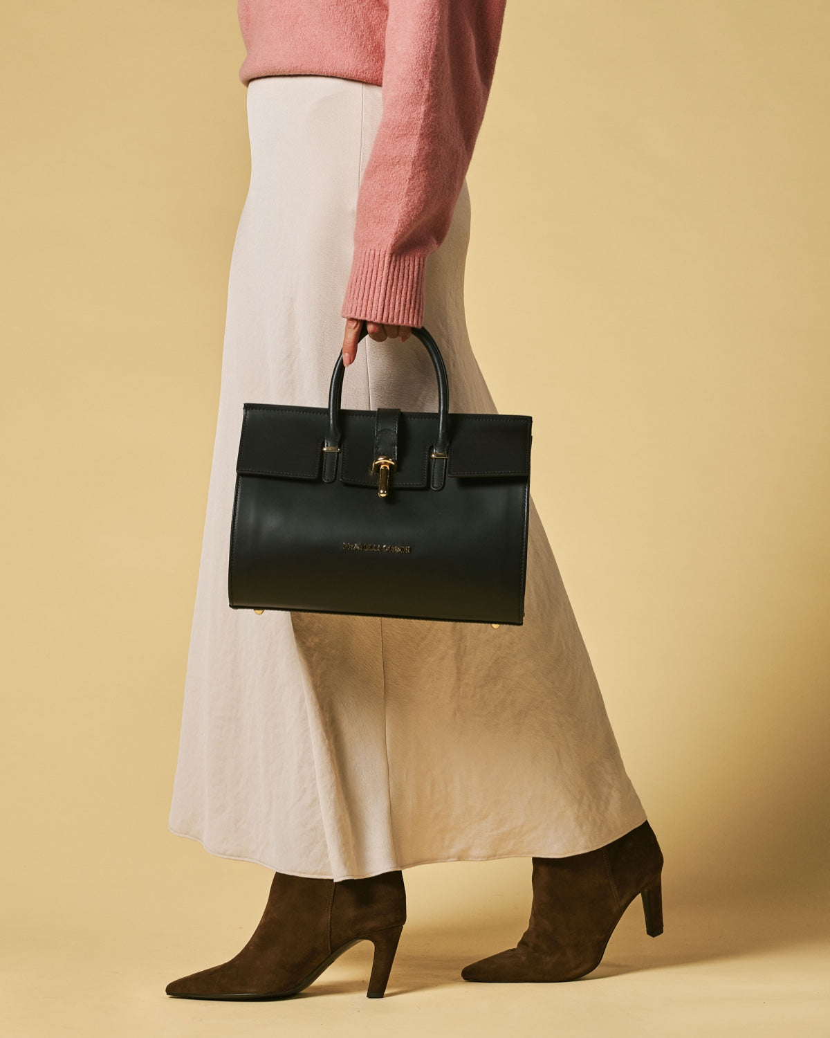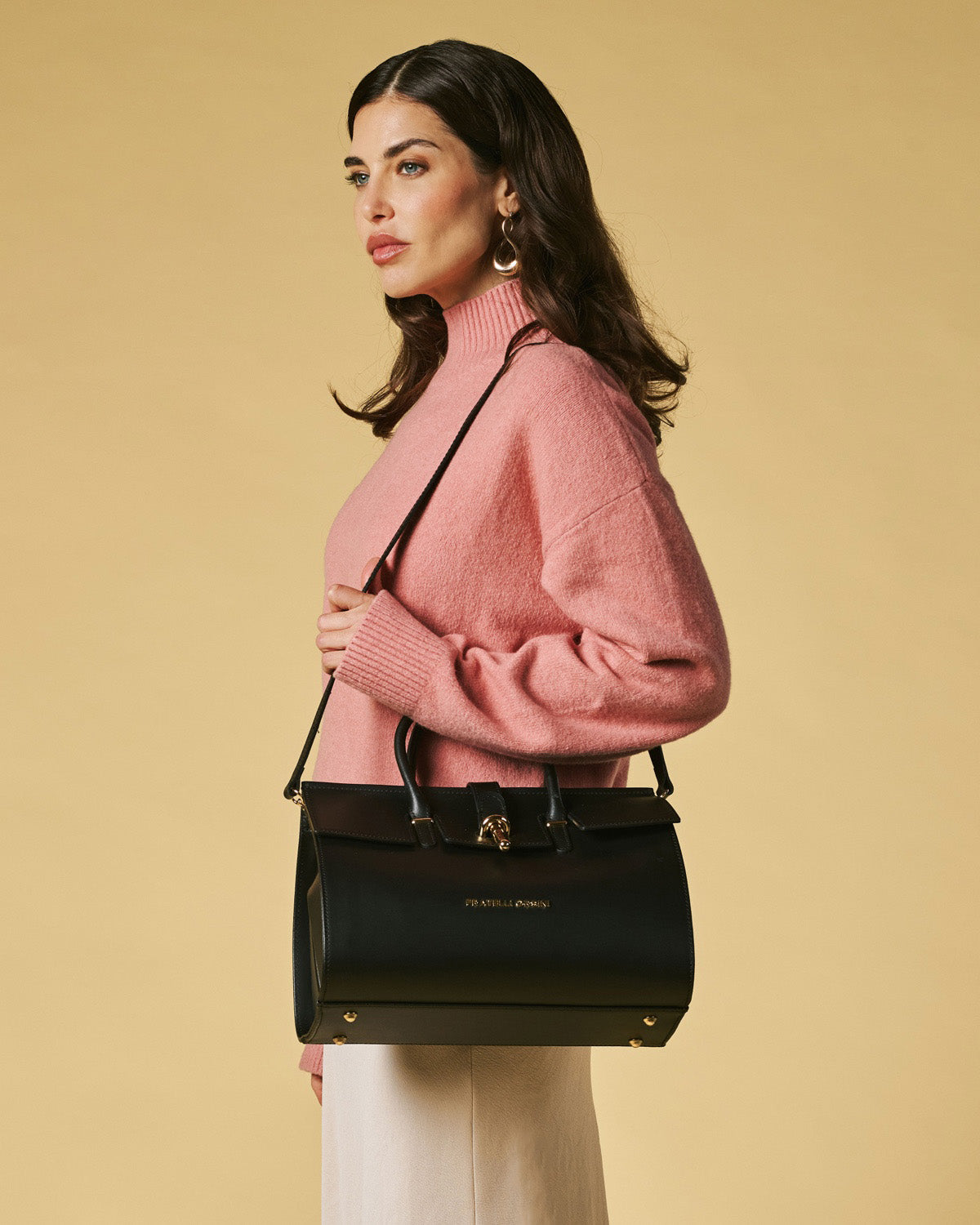 The Oriana handbag from Fratelli Orsini is defined by its structured elegance and refined top-handle silhouette. Handmade in Italy by skilled artisans, it is crafted from full-grain calf leather with a smooth finish that gives the design a polished look. The gold-toned clasp detail adds a subtle focal point while keeping the overall character understated and timeless.