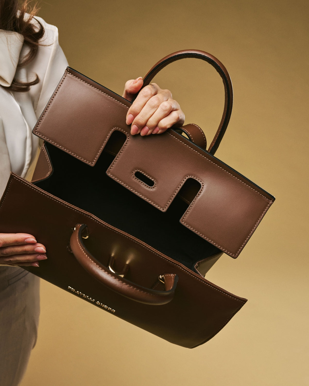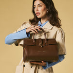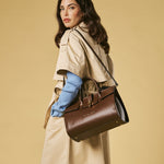 The Oriana handbag from Fratelli Orsini is defined by its structured elegance and refined top-handle silhouette. Handmade in Italy by skilled artisans, it is crafted from full-grain calf leather with a smooth finish that gives the design a polished look. The gold-toned clasp detail adds a subtle focal point while keeping the overall character understated and timeless.