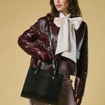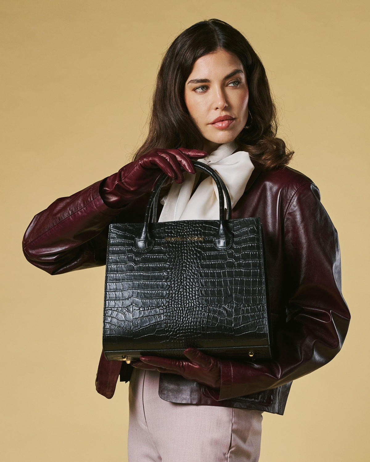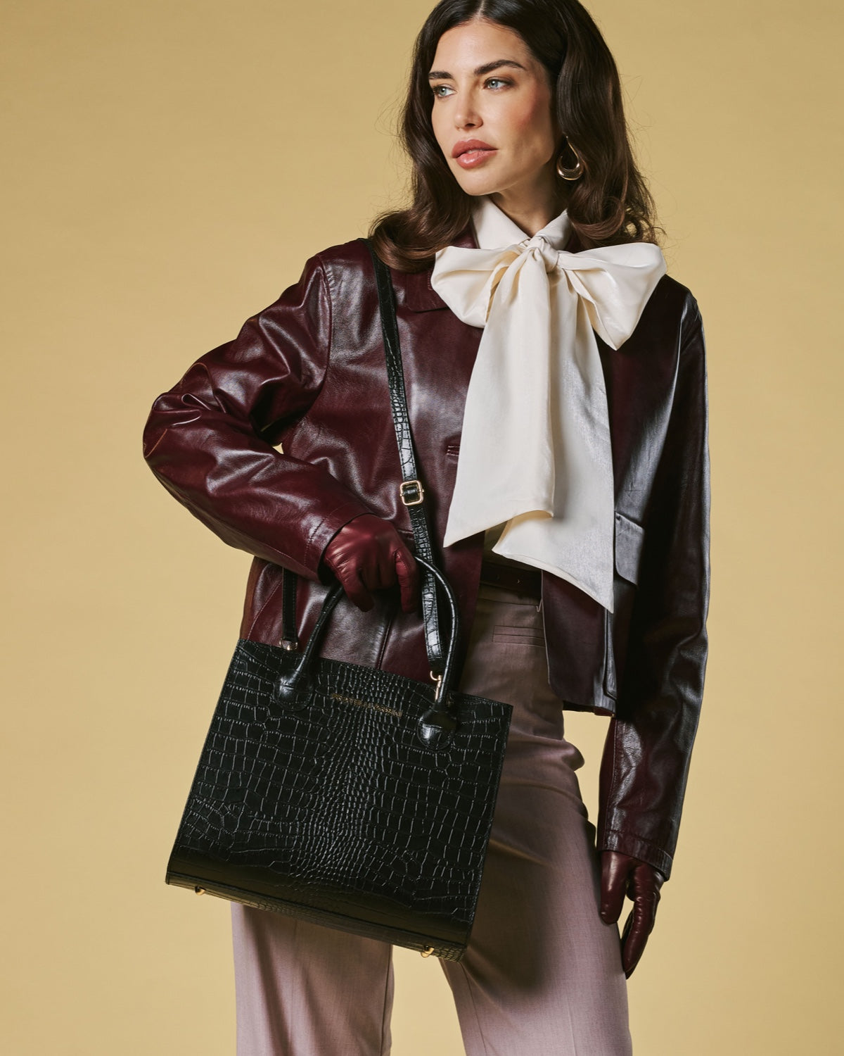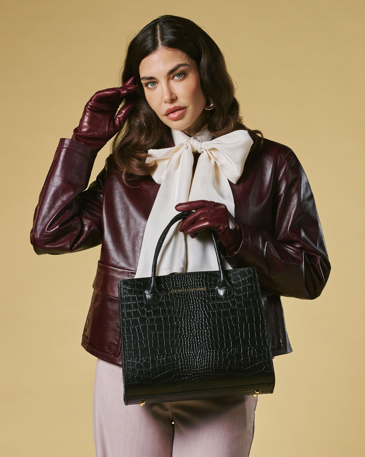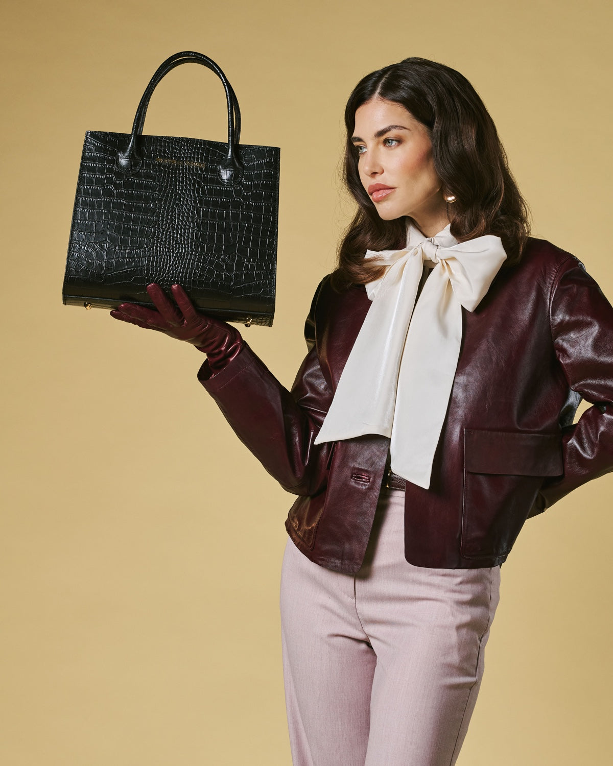 The Patrizia handbag from Fratelli Orsini combines a structured silhouette with a refined, architectural presence. Handmade in Italy by skilled artisans, it is crafted from embossed calf leather with a crocodile texture that adds depth and character while maintaining a polished and elegant look. The top-handle design enhances its poised appearance, making it a sophisticated choice for both business and everyday wear.