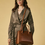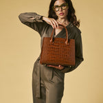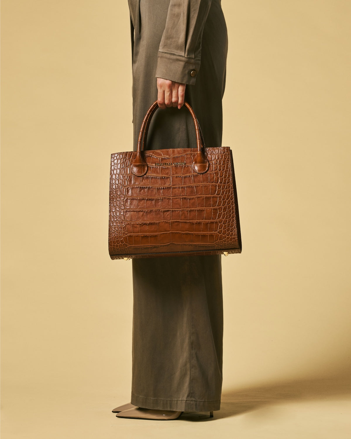 The Patrizia handbag from Fratelli Orsini combines a structured silhouette with a refined, architectural presence. Handmade in Italy by skilled artisans, it is crafted from embossed calf leather with a crocodile texture that adds depth and character while maintaining a polished and elegant look. The top-handle design enhances its poised appearance, making it a sophisticated choice for both business and everyday wear.